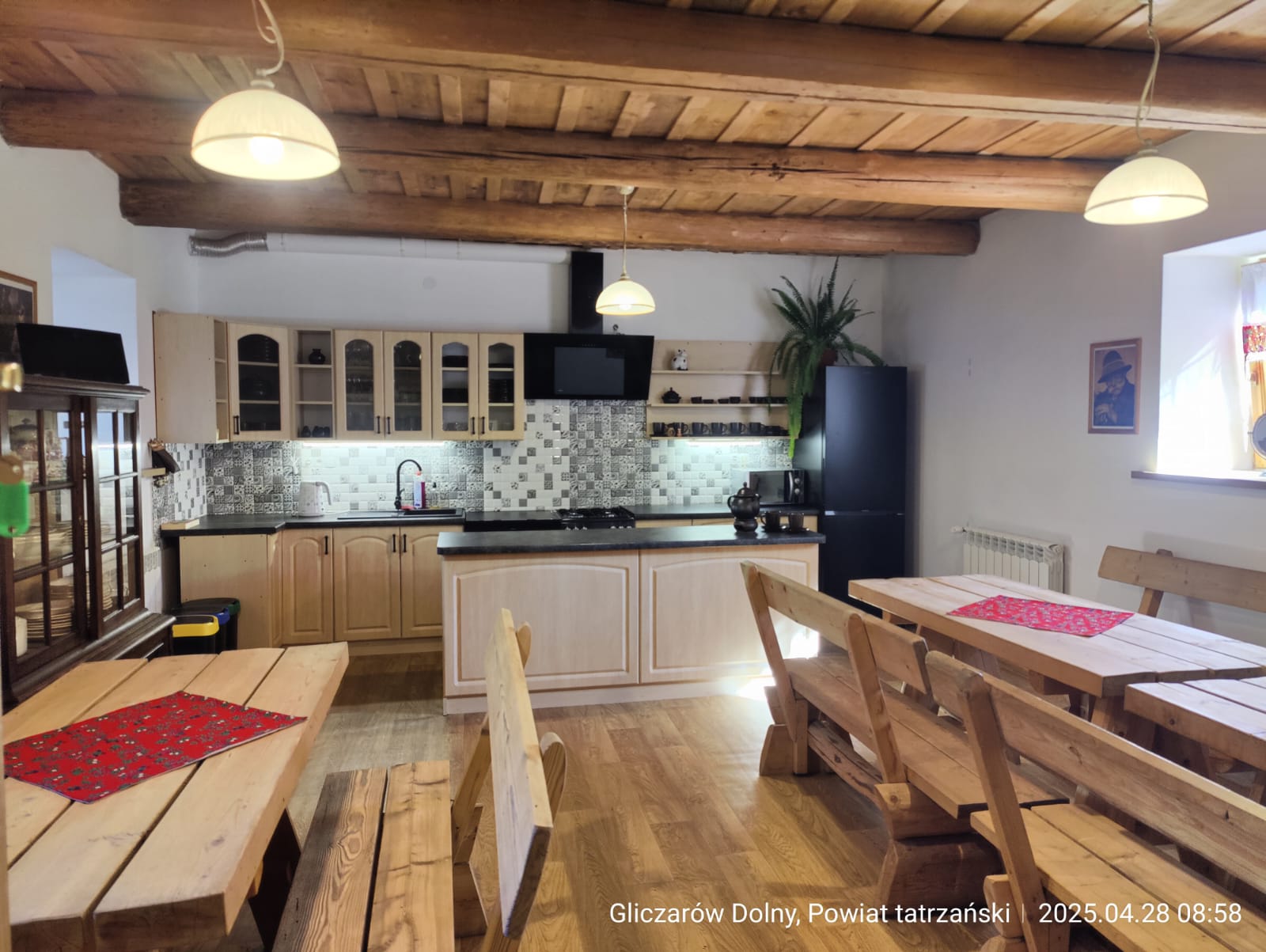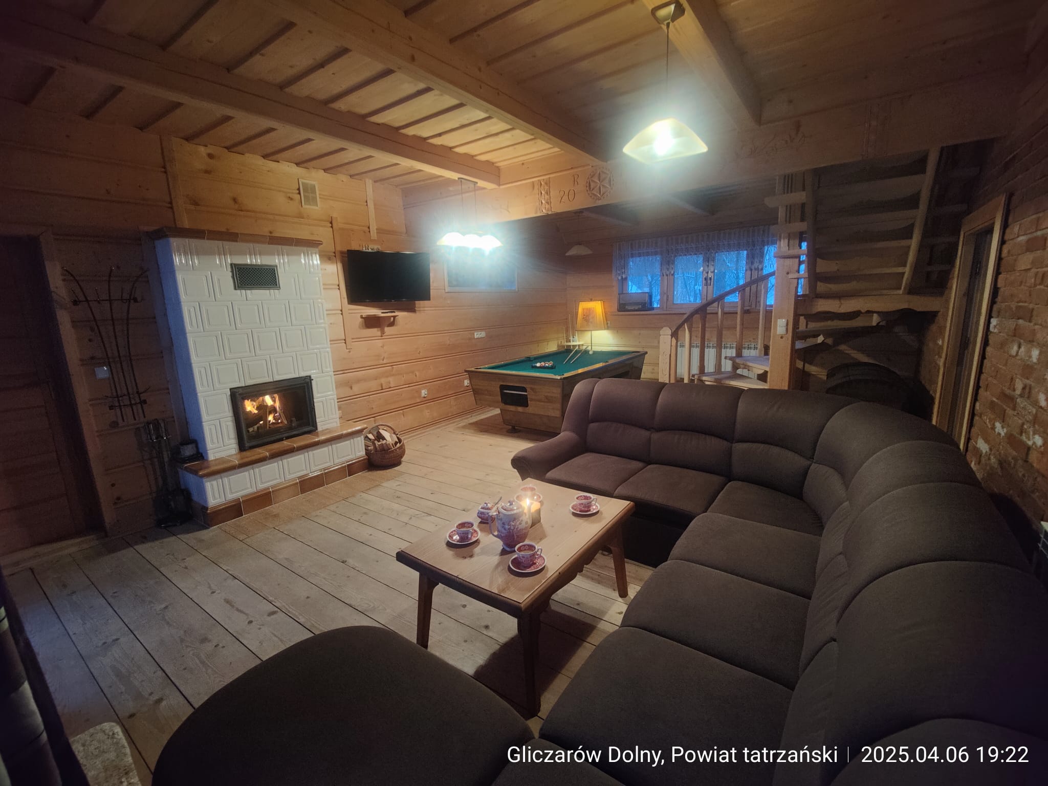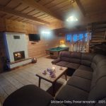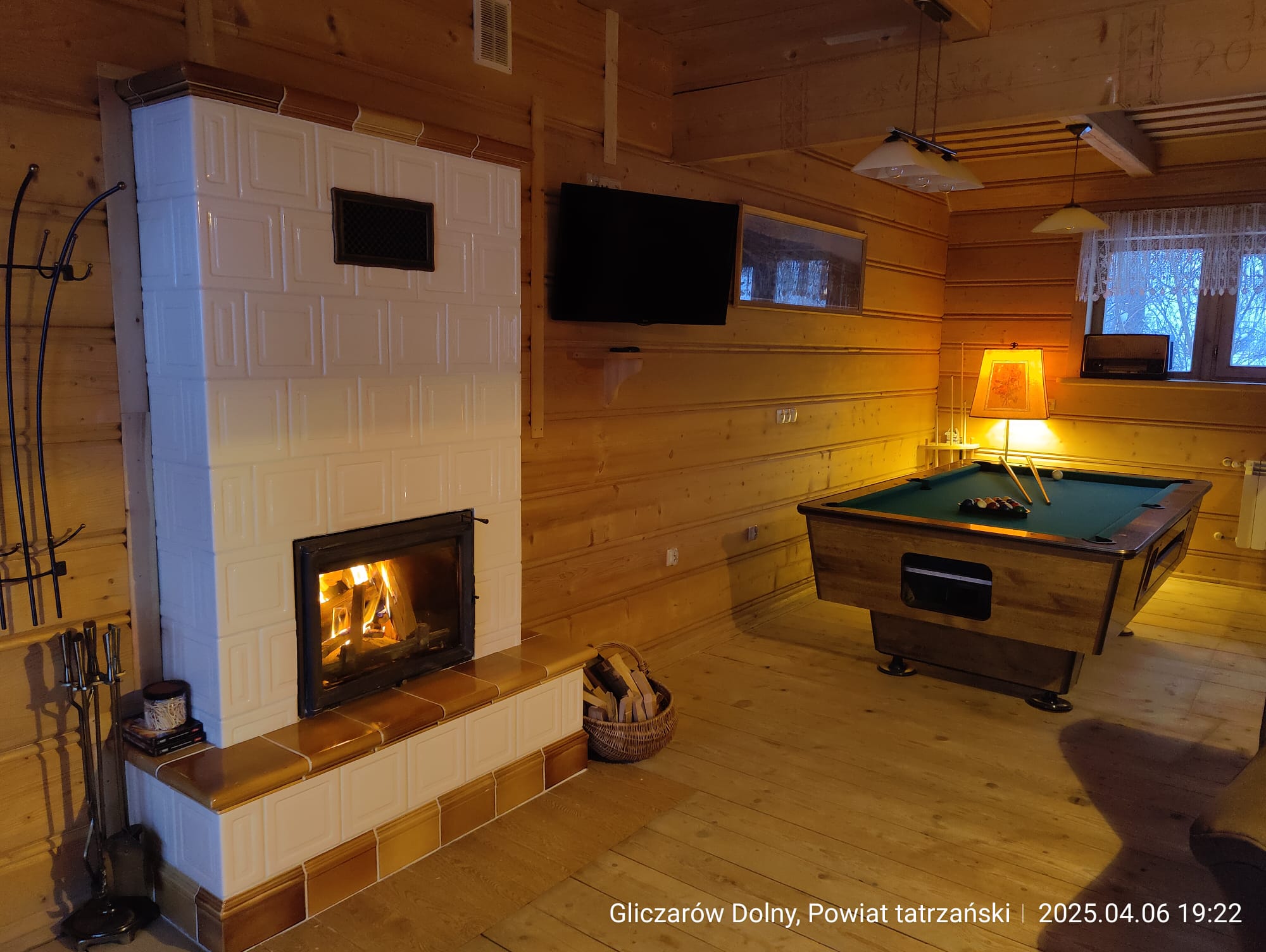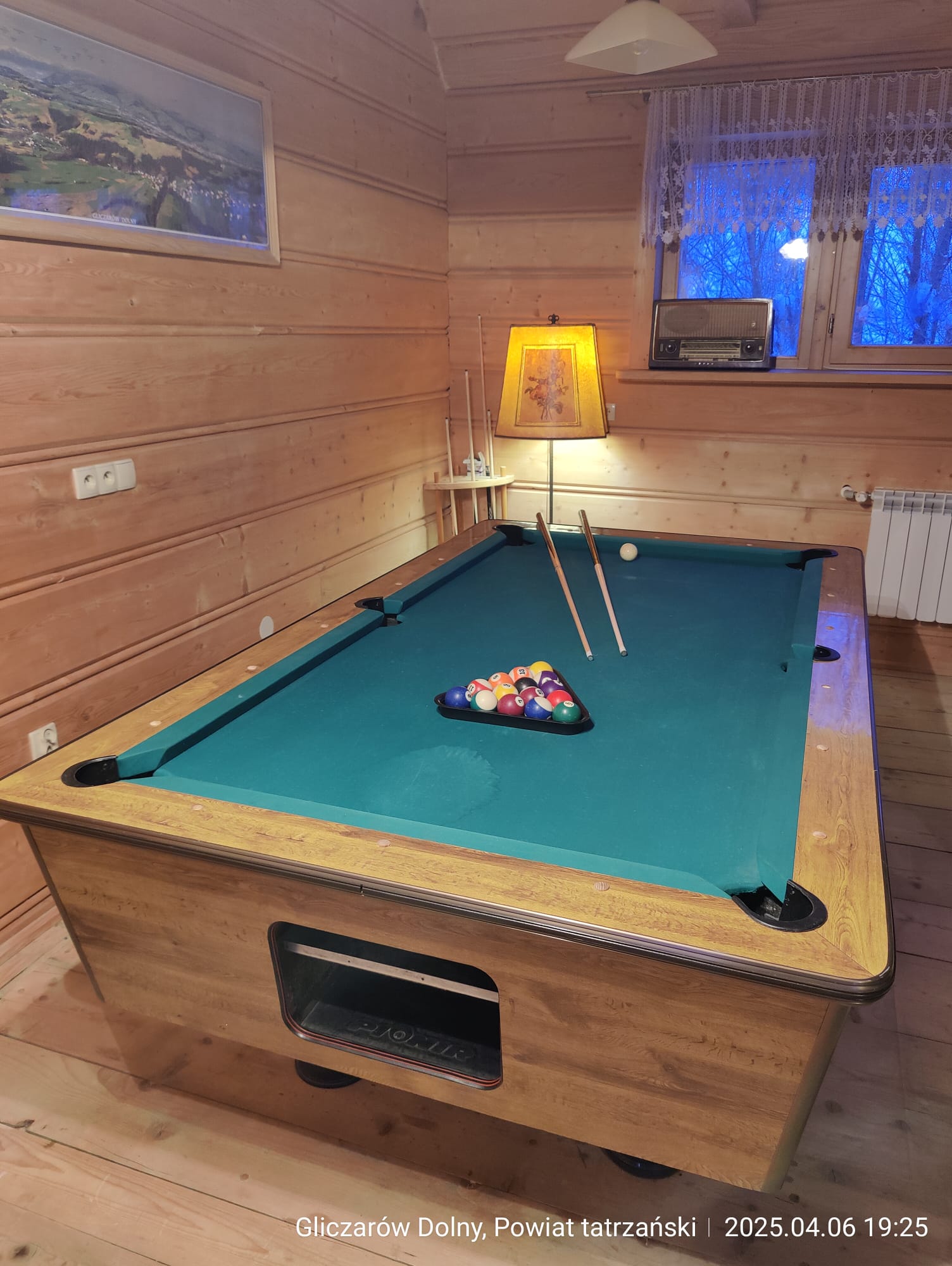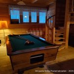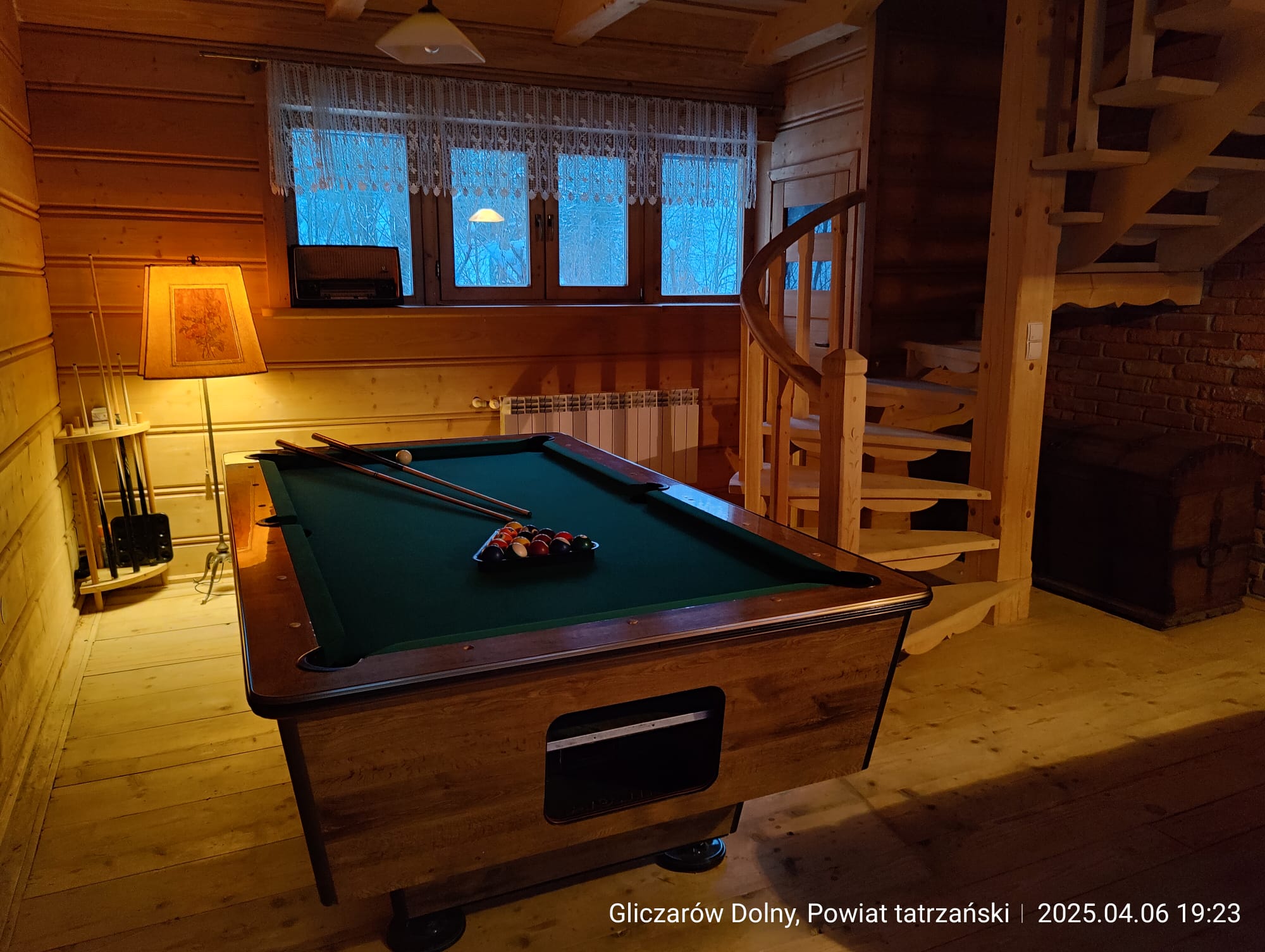 Na dole znajduje sie duża kuchnia która pomieści wszystkich spragnionych góralskich smaków gości, duży salon z kominkiem oraz pozwalający miło spędzić czas stół bilardowy.